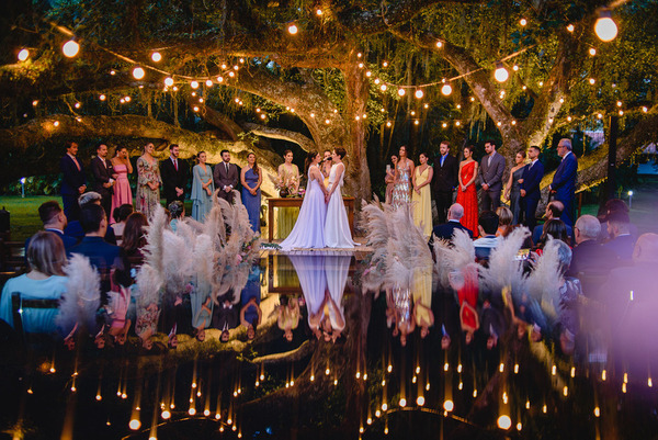 Normalmente casamentos ao ar livre precisam de uma boa estrutura para a iluminação, senão seus convidados ficarão no breu. Amarre fios de luzes em toda a pista de dança, pendure lanternas ou coloque iluminação específica nas árvores.
